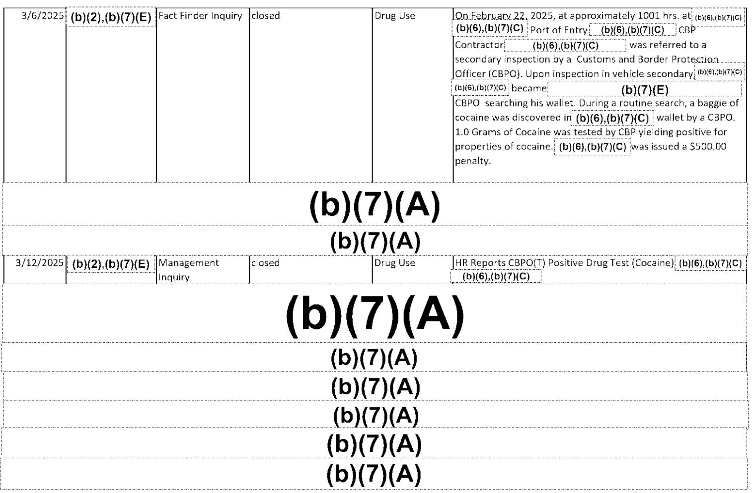 April 7, 2025: A Border Patrol Processing Coordinator (BPPC) returned a positive drug test for marijuana. Records indicated the employee was no longer active with Customs and Border Protection (CBP).