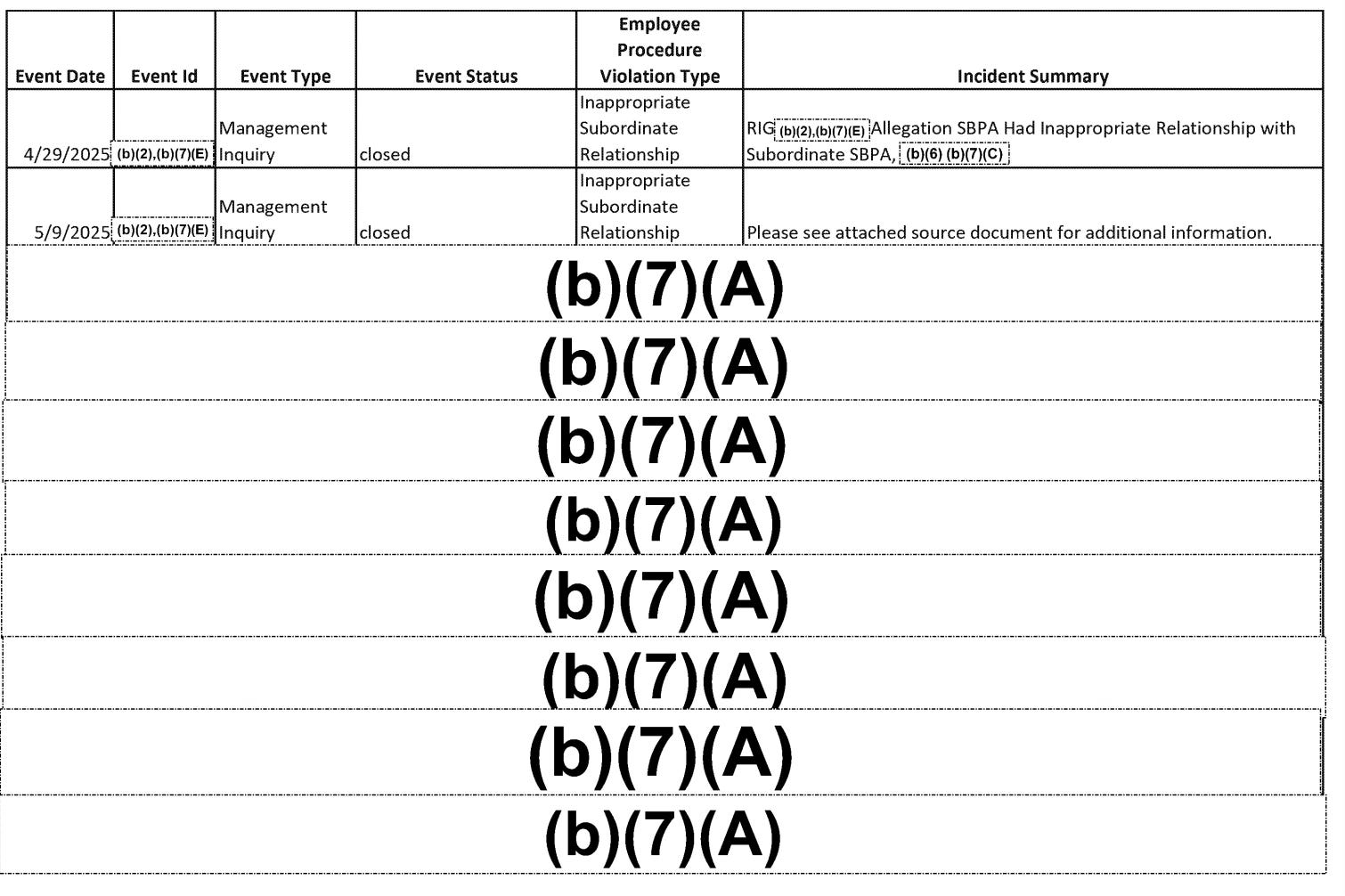 April 29, 2025: A management inquiry investigated an allegation that a Supervisory Border Patrol Agent (SBPA) had an inappropriate relationship with a subordinate Supervisory Border Patrol Agent (SBPA).
