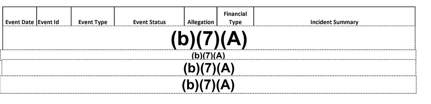 Exemption (b)(7)(A): Every single entry under the “Financial Type” header—including the Event Date, Event ID, Allegation, and Incident Summary—is completely redacted under (b)(7)(A).