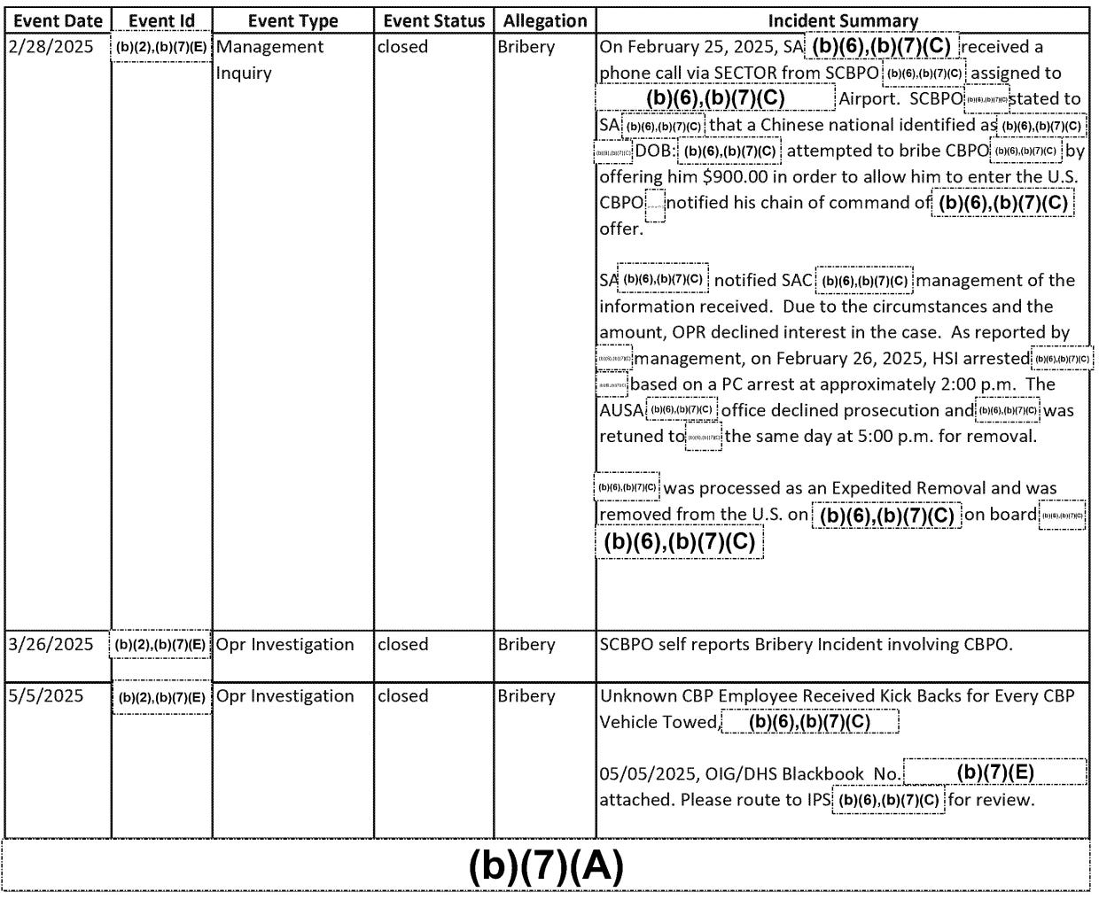 May 5, 2025: An investigation was opened into an unknown Customs and Border Protection (CBP) employee receiving kickbacks for every CBP vehicle towed.